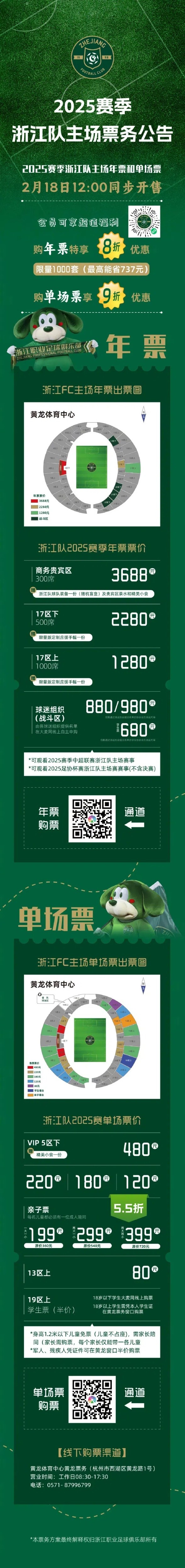 2月18日訊 浙江隊(duì)官方公布了2025賽季主場(chǎng)年票和單場(chǎng)球票的票務(wù)方案,2月18日12:00將同步開售。