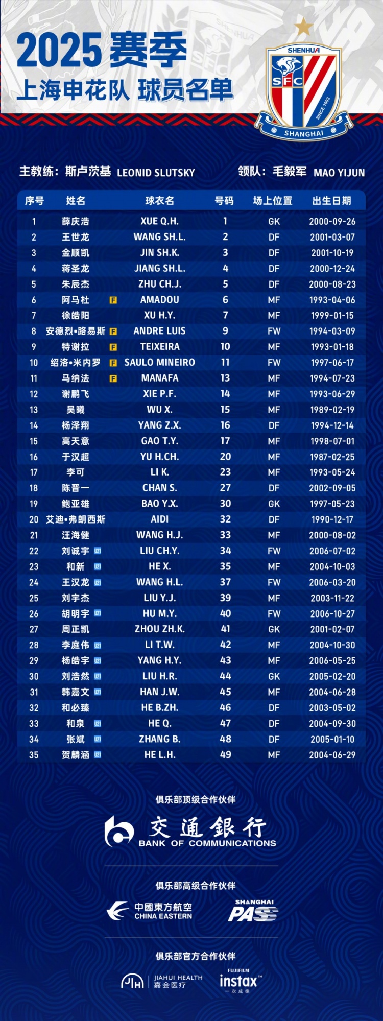 2月20日訊 上海申花官方公布了2025賽季一線隊球員名單,阿馬杜、路易斯、特謝拉、米內(nèi)羅、馬納法5名外援領(lǐng)銜,吳曦、朱辰杰、于漢超、李可、劉誠宇等球員在列,共35名球員入選。