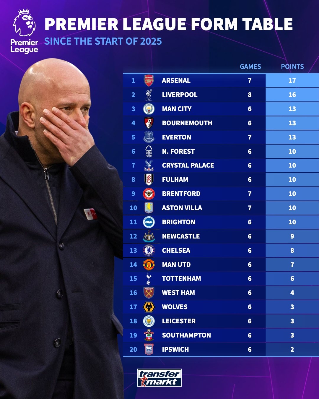 2月20日訊 德國轉(zhuǎn)會市場統(tǒng)計了2025年開始至今英超球隊拿到的積分,并列出榜單,阿森納17分居首,利物浦16分次席。