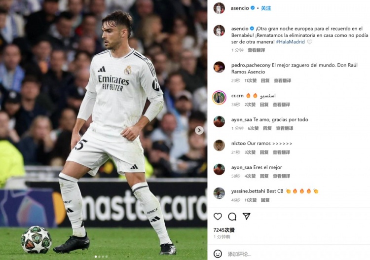 他也在賽后通過社媒曬出自己的比賽照,并配文:“在伯納烏球場(chǎng)的又一個(gè)值得銘記的歐冠之夜!我們?cè)谥鲌?chǎng)成功從附加賽突圍,除此之外也別無其他可能!馬德里前進(jìn)!”