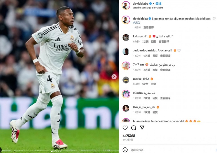 2月20日訊 皇馬在本輪歐冠3-1擊敗曼城,阿拉巴傷愈復(fù)出,在最后時(shí)刻替補(bǔ)登場。他也曬出自己的比賽照,并配文:“晉級下一輪!晚安,皇馬球迷們!”32歲的阿拉巴當(dāng)前合同2026年到期,本賽季各項(xiàng)賽事共計(jì)出場5次。 本文標(biāo)簽: 足球 西甲 皇家馬德里 英超 曼城 歐冠