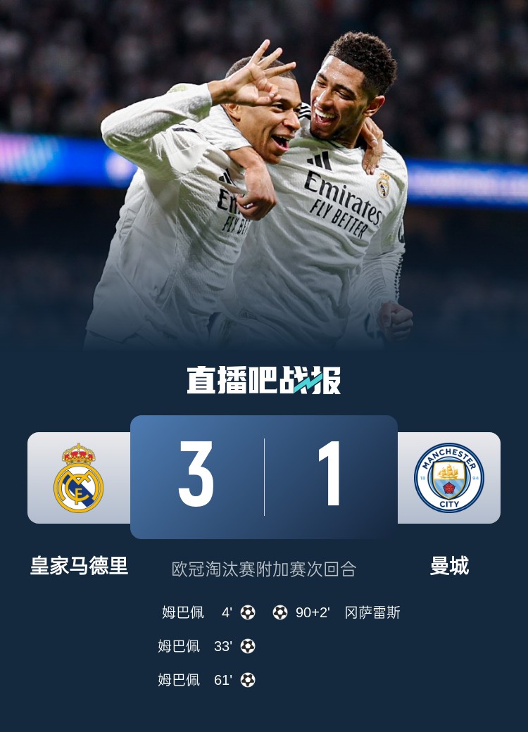 姆巴佩戴帽!皇馬3-1曼城總比分6-3晉級(jí)16強(qiáng) 下輪戰(zhàn)馬競(jìng)或藥廠