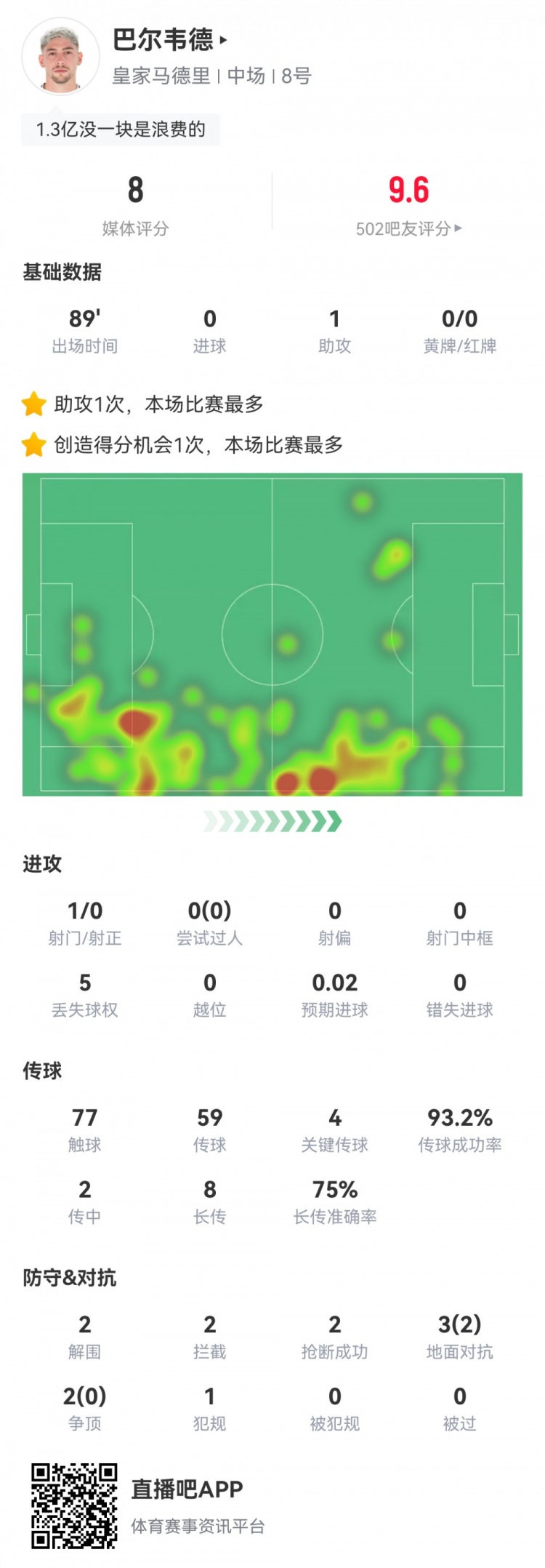 2月20日訊 歐冠淘汰賽附加賽次回合,姆巴佩上演帽子戲法,皇馬3-1總比分6-3曼城晉級(jí)16強(qiáng)!此役再次客串右后衛(wèi)的巴爾韋德發(fā)揮依舊出色,球員全場(chǎng)重點(diǎn)數(shù)據(jù)如下↓