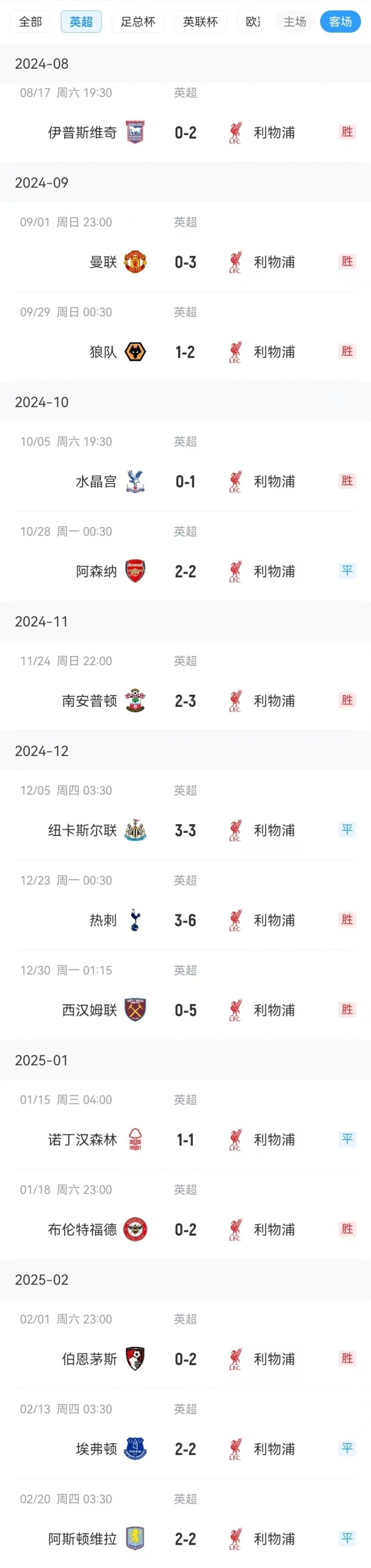 2月20日訊 本輪英超焦點戰(zhàn)阿斯頓維拉2-2戰(zhàn)平利物浦,延續(xù)了本賽季客場不敗勢頭,也是至今唯一一隊。數據統(tǒng)計顯示,利物浦在本賽季共計14個英超客場比賽取得9勝,僅被5次逼平,至今保持不敗。 本文標簽: 足球 英超 利物浦 阿斯頓維拉