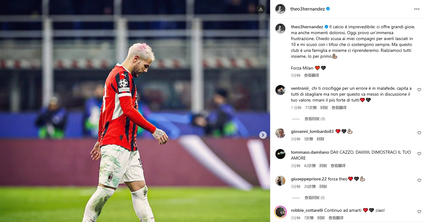 特奧:“足球是不可預(yù)測(cè)的,它帶給我們巨大的快樂(lè),也有痛苦時(shí)刻。今天我感到無(wú)比的沮喪。我向我的隊(duì)友們道歉,因?yàn)槲易屗麄冎皇O?0個(gè)人作戰(zhàn)。我也向一直支持我們的球迷們道歉。但這個(gè)俱樂(lè)部就像是一個(gè)大家庭,團(tuán)結(jié)一致我們會(huì)恢復(fù)的。讓我們一起重新站起來(lái),從我開(kāi)始。????????”
