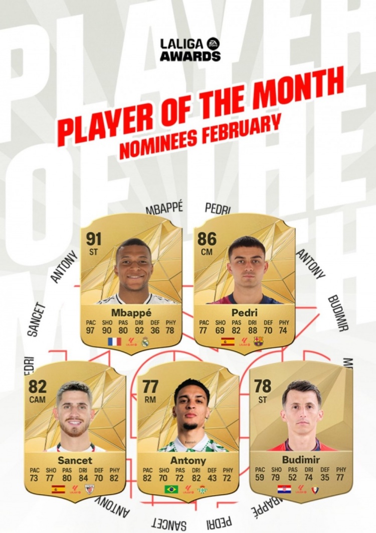 2月20日訊 西甲官方公布了2月份最佳球員的5人候選,姆巴佩、佩德里、安東尼入圍。在2月份,西甲還有第25輪比賽未進(jìn)行。西甲2月最佳球員候選:姆巴佩(皇馬):3場聯(lián)賽2球佩德里(巴薩):3場聯(lián)賽1助安東尼(貝蒂斯):3場聯(lián)賽2球1助桑謝特(畢爾巴鄂競技):3場聯(lián)賽5球布迪米爾(奧薩蘇納):3場聯(lián)賽3球 本文標(biāo)簽: 足球 西甲 皇家馬德里 巴塞羅那 奧薩蘇納 畢爾巴鄂競技 貝蒂斯 姆巴佩
