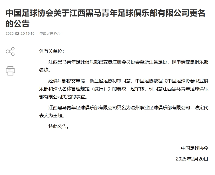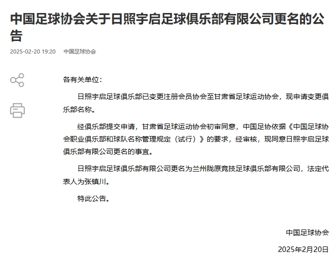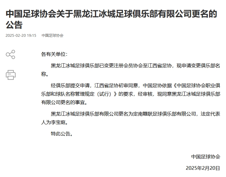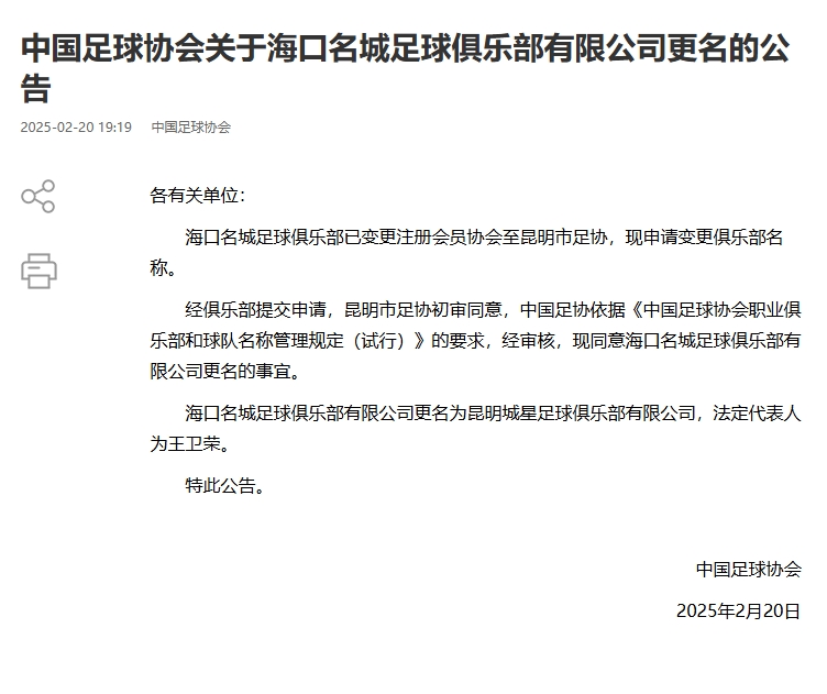02月20日訊 中國(guó)足協(xié)官宣5家職業(yè)足球俱樂(lè)部的更名事宜,此前這5家俱樂(lè)部已經(jīng)變更注冊(cè)會(huì)員協(xié)會(huì),也就是俗稱(chēng)的“異地搬遷”。