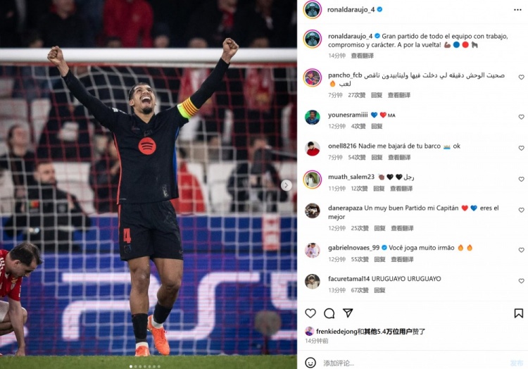 隊長阿勞霍也在個人社媒曬出仰天長嘯慶祝照,配文寫道:“全隊?wèi){借努力、決心以及意志踢出一場精彩的比賽,讓我們下一回合再來!”