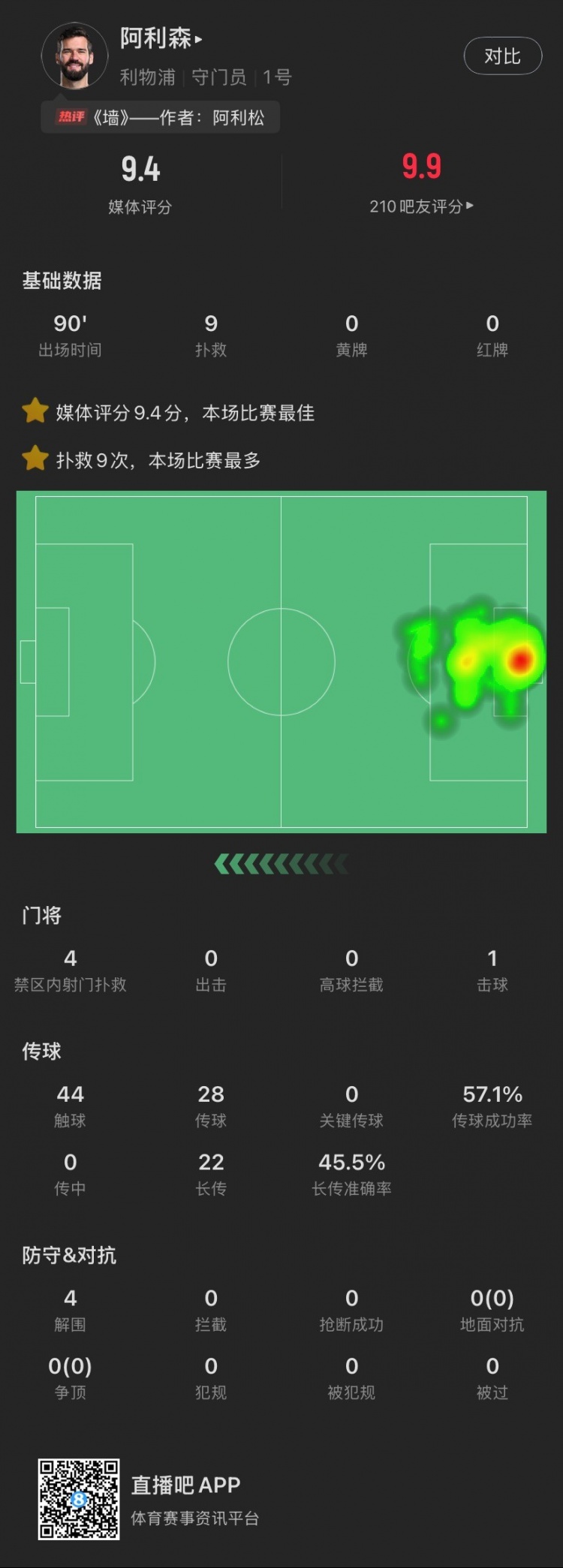 3月6日訊 在剛剛結(jié)束的歐冠1/8決賽中,利物浦1-0絕殺巴黎。本場比賽,巴黎狂轟27腳射門、10腳射正,均被阿利森化解。他獲得了9.4分的評分,全場最高。阿利森本場主要數(shù)據(jù)↓撲救:9禁區(qū)內(nèi)射門撲救:4擊球:1觸球:44傳球:28傳球成功率:57.1%長傳:22長傳準(zhǔn)確率:45.5%解圍:4 本文標(biāo)簽: 足球 英超 利物浦 巴黎圣日耳曼 歐冠