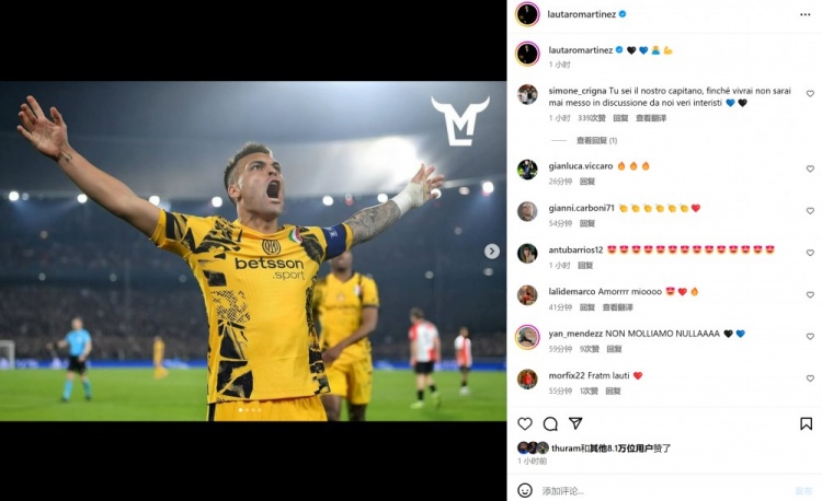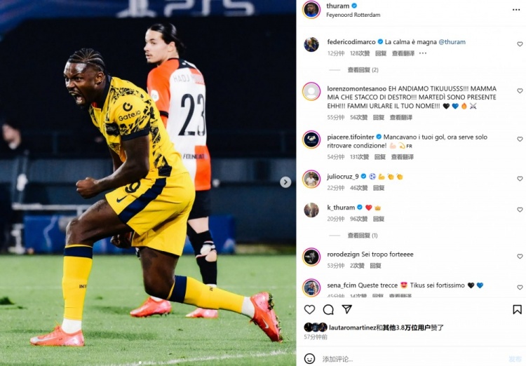 3月6日訊 在本輪歐冠,國米客場2-0擊敗費(fèi)耶諾德。本場比賽勞塔羅與小圖拉姆雙雙破門,賽后兩人也分別在個(gè)人社媒曬出本場進(jìn)球后怒吼慶祝的照片。 本文標(biāo)簽: 足球 意甲 國際米蘭