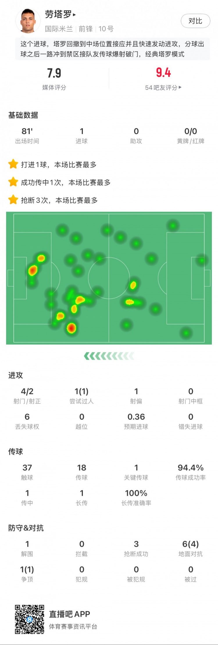3月6日訊 歐冠1/8決賽首回合,國米客場2-0費耶諾德,勞塔羅本場數(shù)據(jù):1粒進球4次射門2次射正1次過人成功1次37次觸球18次傳球成功17次1次關(guān)鍵傳球1次傳中成功1次1次長傳成功1次6次地面對抗贏得4次1次爭頂贏得1次6次丟失球權(quán)1次解圍3次搶斷 本文標簽: 足球 意甲 國際米蘭