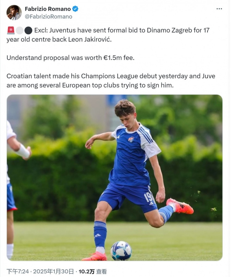 1月30日訊 據意大利記者羅馬諾透露,尤文150萬歐報價薩格勒布迪納摩17歲中衛(wèi)亞基羅維奇。亞基羅維奇在薩格勒布迪納摩對陣米蘭的歐冠比賽中替補出場,上演歐冠首秀。羅馬諾指出,多家歐洲頂級俱樂部有意簽下這位17歲的克羅地亞中衛(wèi)。尤文已經向薩格勒布迪納摩提交了正式報價,金額為150萬歐元。亞基羅維奇與薩格勒布迪納摩的合同2026年到期,他也是克羅地亞U17國家隊成員。 本文標簽: 足球 意甲 尤文圖斯 轉會