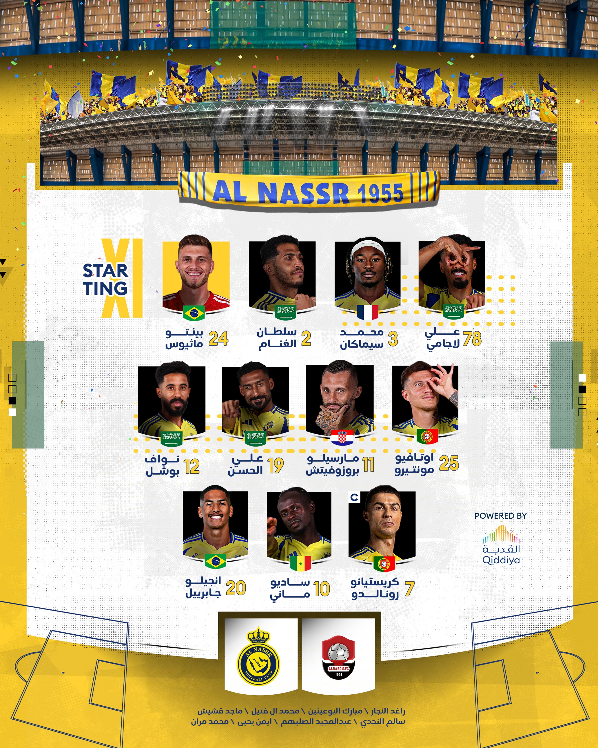 利雅得勝利首發(fā):24-本托、2-哈納姆、3-西馬坎、78-奧賈米、12-納瓦夫、11-布羅佐維奇、19-哈桑、25-奧塔維奧、20-安吉洛、10-馬內(nèi)、7-C羅
