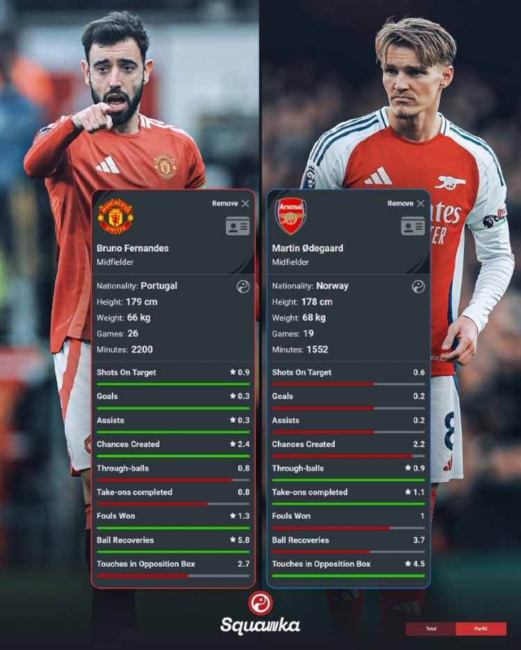 3月8日訊 曼聯(lián)將在本輪英超迎戰(zhàn)阿森納,數(shù)據(jù)機構squakwa也對比了兩隊核心的本賽季英超每90分鐘關鍵數(shù)據(jù),B費在多項數(shù)據(jù)領先。
