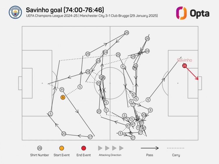 數(shù)據(jù)統(tǒng)計(jì)顯示,薩維尼奧的進(jìn)球在此前經(jīng)歷了曼城球員的42次傳導(dǎo),是有統(tǒng)計(jì)(03-04賽季)以來(lái)歐冠傳導(dǎo)次數(shù)最多的進(jìn)球。