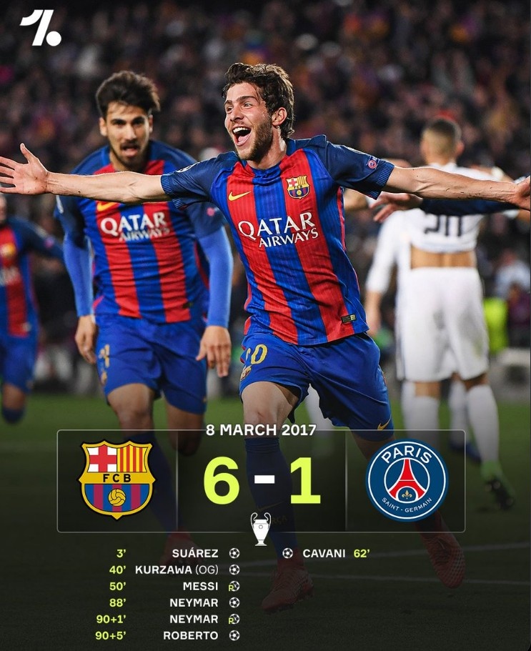 本場(chǎng)比賽蘇亞雷斯開(kāi)場(chǎng)3分鐘破門(mén)拉起反擊號(hào)角,庫(kù)爾扎瓦打進(jìn)烏龍球,下半場(chǎng)梅西破門(mén),雖然卡瓦尼扳回一城,但是內(nèi)馬爾梅開(kāi)二度,羅貝托在補(bǔ)時(shí)第5分鐘打進(jìn)反超總比分的一球。