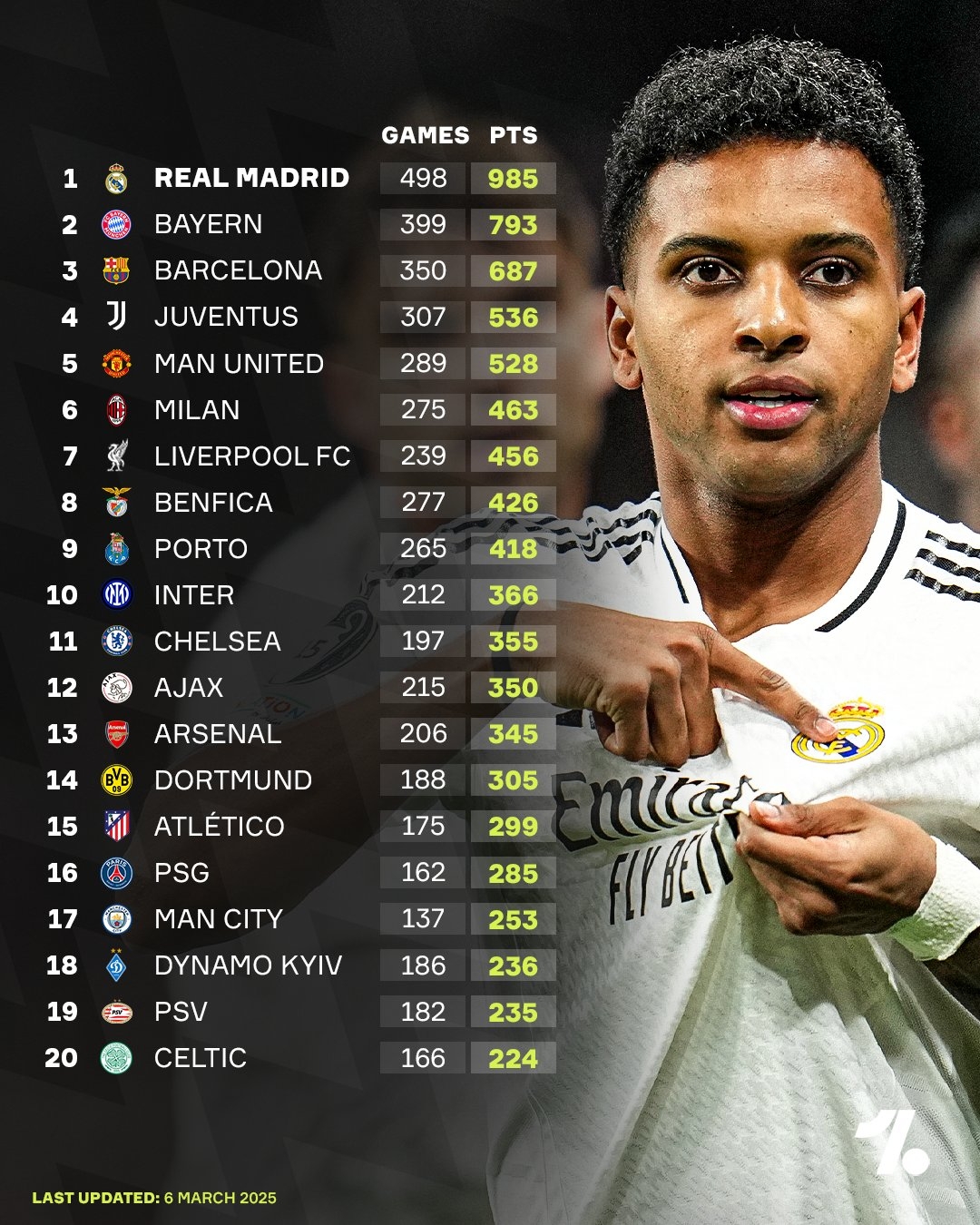 在OneFootball公布的歐冠歷史積分榜上,皇馬以498場比賽積985分的成績高居榜首,拜仁399場積793分排在第二位,巴薩350場比賽687分位列第三。