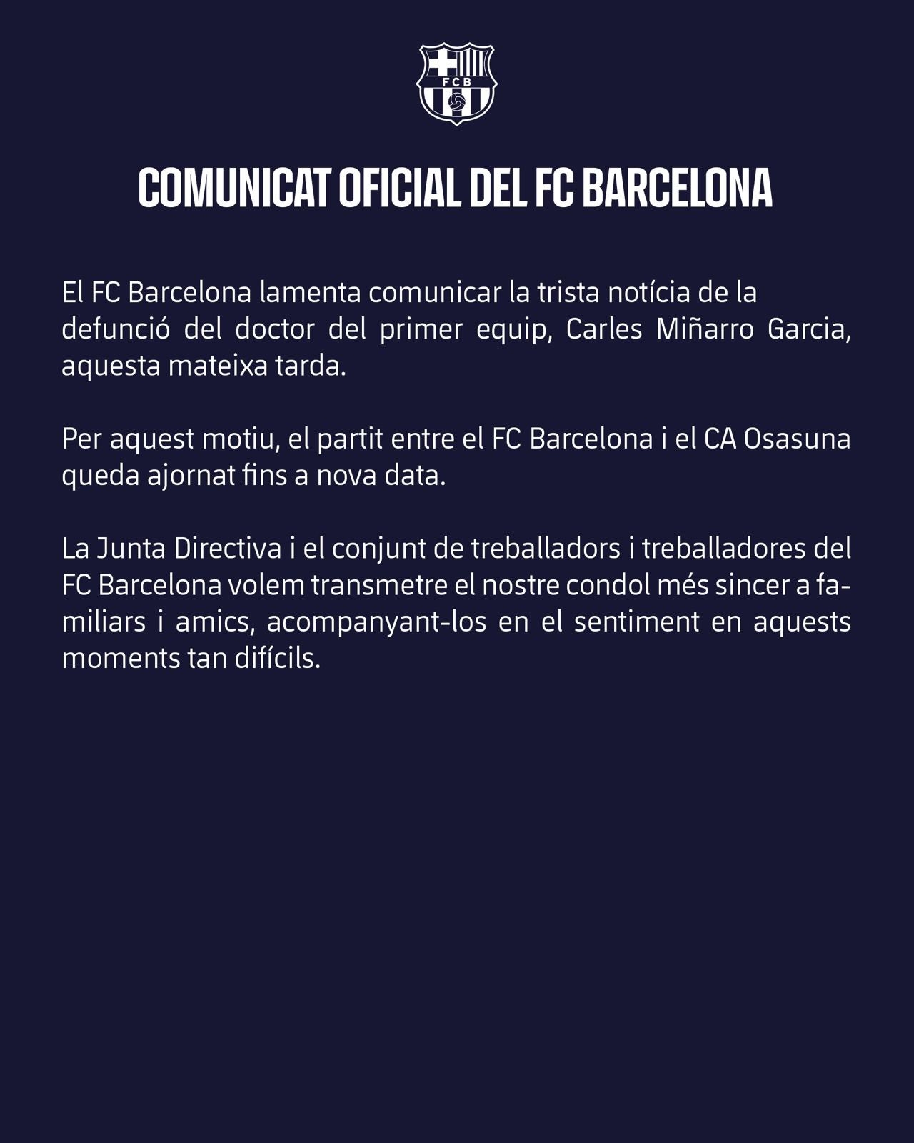 突發(fā)!巴薩官方:因一線隊隊醫(yī)去世,巴薩vs奧薩蘇納延期進行