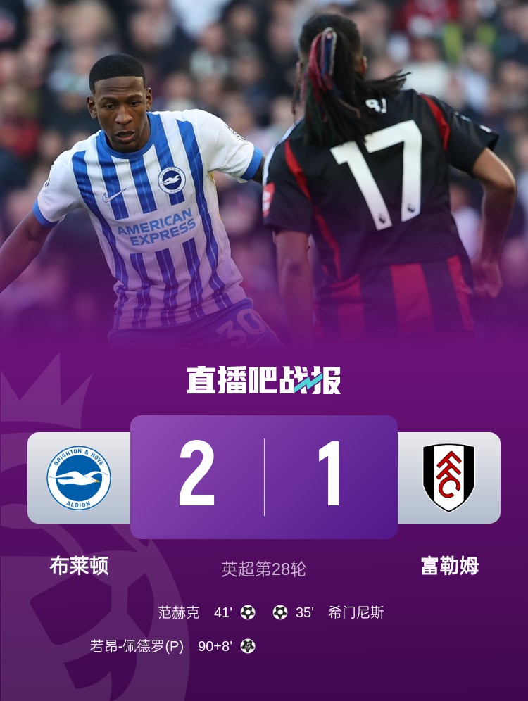 英超第28輪,布萊頓2-1逆轉富勒姆。上半場,希門尼斯首開記錄,伊沃比助攻,范赫克冒頂后將功補過扳平;下半場,三笘薰進球越位,佩德羅讀秒造點+點射絕殺。