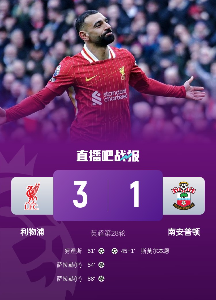 英超第28輪,利物浦3-1逆轉南安普頓。上半場,利物浦防線出現(xiàn)失誤,斯莫爾伯恩破門;下半場,努涅斯破門+造點,薩拉赫點射,菅原由勢手球送點,薩拉赫點射再中。