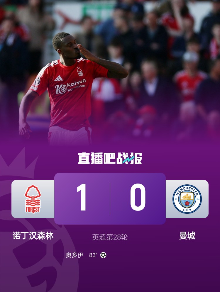 英超第28輪,曼城0-1不敵諾丁漢森林。上半場,岡薩雷斯遠射中柱;下半場,奧多伊中柱,比賽尾聲奧多伊爆射破門。