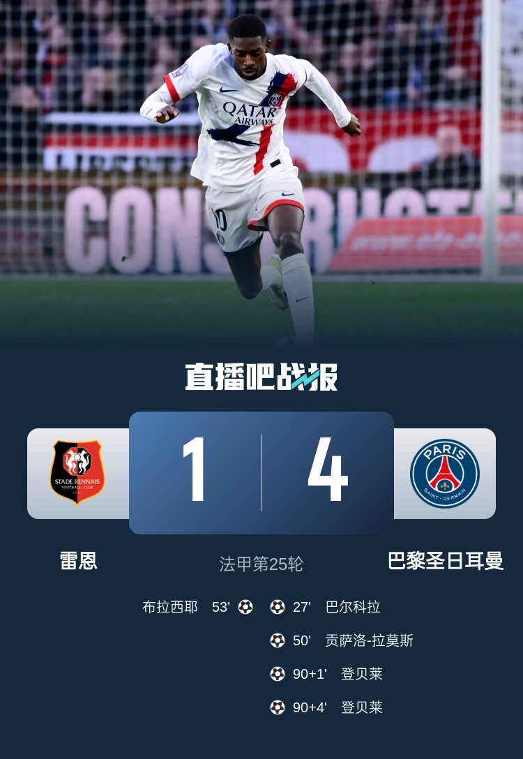 法甲第25輪,巴黎4-1大勝雷恩。上半場,巴爾科拉破門,隨后故意手球未吃牌,半場補時假摔最終領到黃牌;下半場,巴爾科拉助攻G-拉莫斯破門,布拉西耶扳回一球,登貝萊替補登場補時雙響。