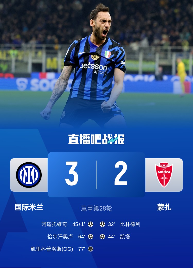 意甲第28輪,國米3-2逆轉蒙扎。上半場,勞塔羅破門被吹無效,圖拉精彩撲救,比林德利首開記錄,凱塔遠射世界波,阿瑙托維奇扳回一城;下半場,恰爾漢奧盧凌空抽射扳平,勞塔羅頭球造烏龍,小圖拉姆推射中柱。