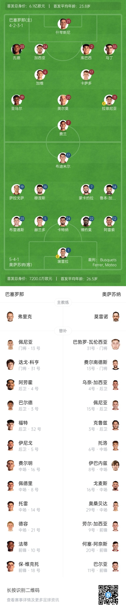 巴薩首發(fā):25-什琴斯尼、24-埃里克-加西亞、2-庫(kù)巴西、35-杰拉德-馬丁、23-孔德、6-加維、17-卡薩多、11-拉菲尼亞、19-亞馬爾、20-奧爾莫、7-費(fèi)蘭