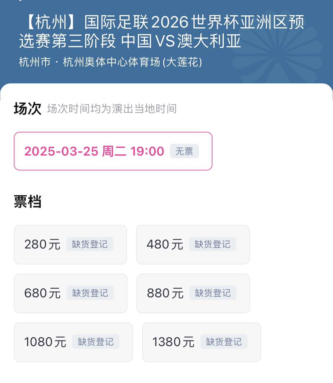 3月25日18強賽國足vs澳大利亞門票早已售罄,官方票務信息顯示,3月11日0:00起停止退票。這個時間點將成為最后的“撿漏”(回流票)的機會。