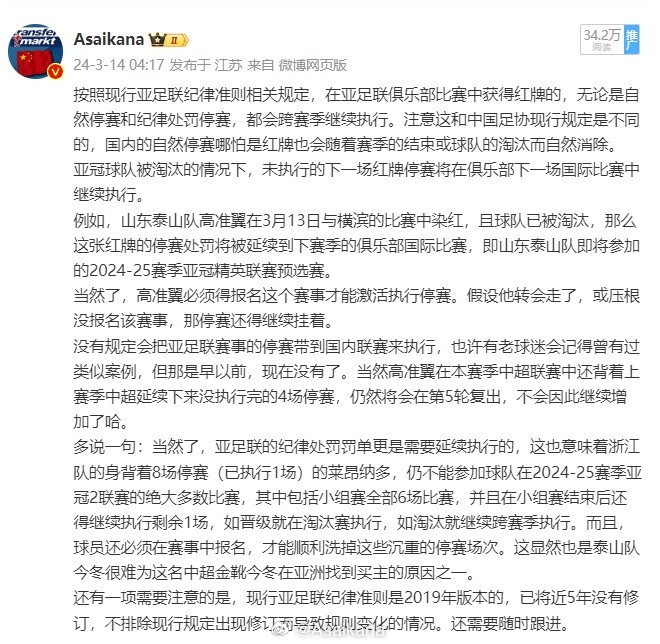 而亞足聯(lián)則相反,紅牌自然停賽需要跨賽季執(zhí)行?,F(xiàn)中足聯(lián)和中國足協(xié)已經(jīng)分家,中足聯(lián)目前還是和中國足協(xié)保持一致,如果中足聯(lián)日后出臺與之不同的新的停賽執(zhí)行細則,職業(yè)聯(lián)賽范疇內(nèi)當(dāng)然也是要以中足聯(lián)的規(guī)定為準(zhǔn)。