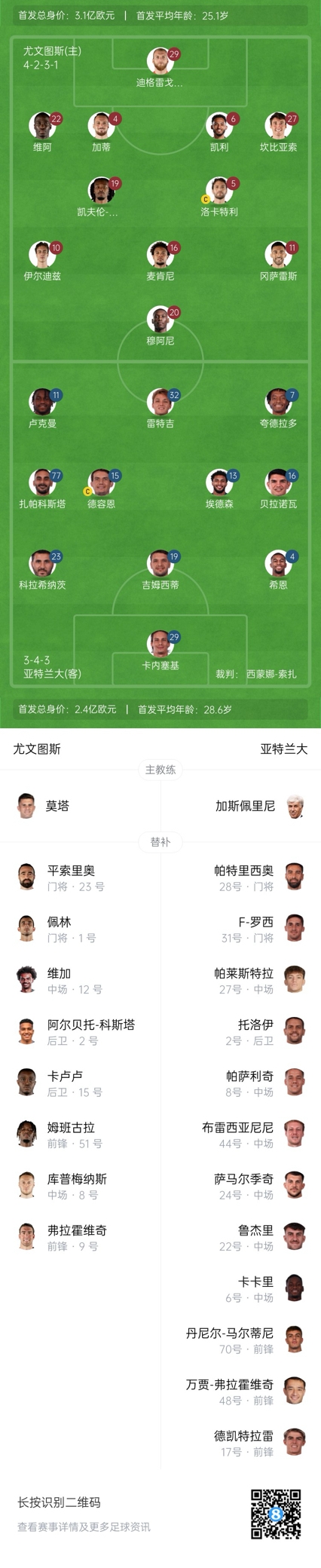 亞特蘭大替補:28-帕特里西奧、31-F-羅西、2-托洛伊、22-魯杰里、6-卡卡里、8-帕薩利奇、24-薩馬爾季奇、44-布雷西亞尼尼、17-德凱特拉雷、27-帕萊斯特拉、48-萬賈-弗拉霍維奇、70-丹尼爾-馬爾蒂尼