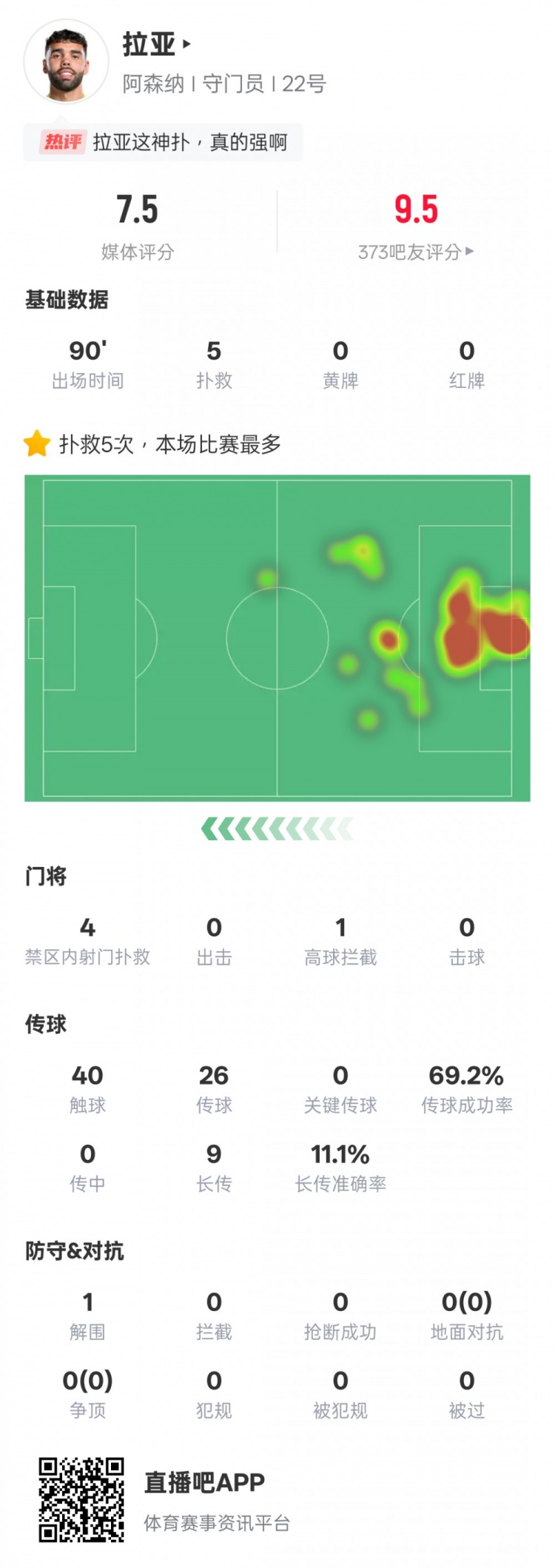 3月10日訊 英超第28輪,阿森納1-1曼聯(lián),拉亞首發(fā)出戰(zhàn),貢獻全場最多的5次撲救,其中有4次是撲救對手禁區(qū)內(nèi)的射門,他還有1次高球攔截,評分7.5。拉亞本場比賽數(shù)據(jù)如下:撲救5禁區(qū)內(nèi)射門撲救4高球攔截1觸球40傳球26傳球成功率69.2%長傳9長傳準(zhǔn)確率11.1%解圍1 本文標(biāo)簽: 足球 英超 阿森納