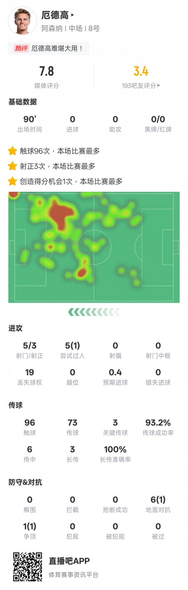 厄德高本場(chǎng)比賽數(shù)據(jù)如下: