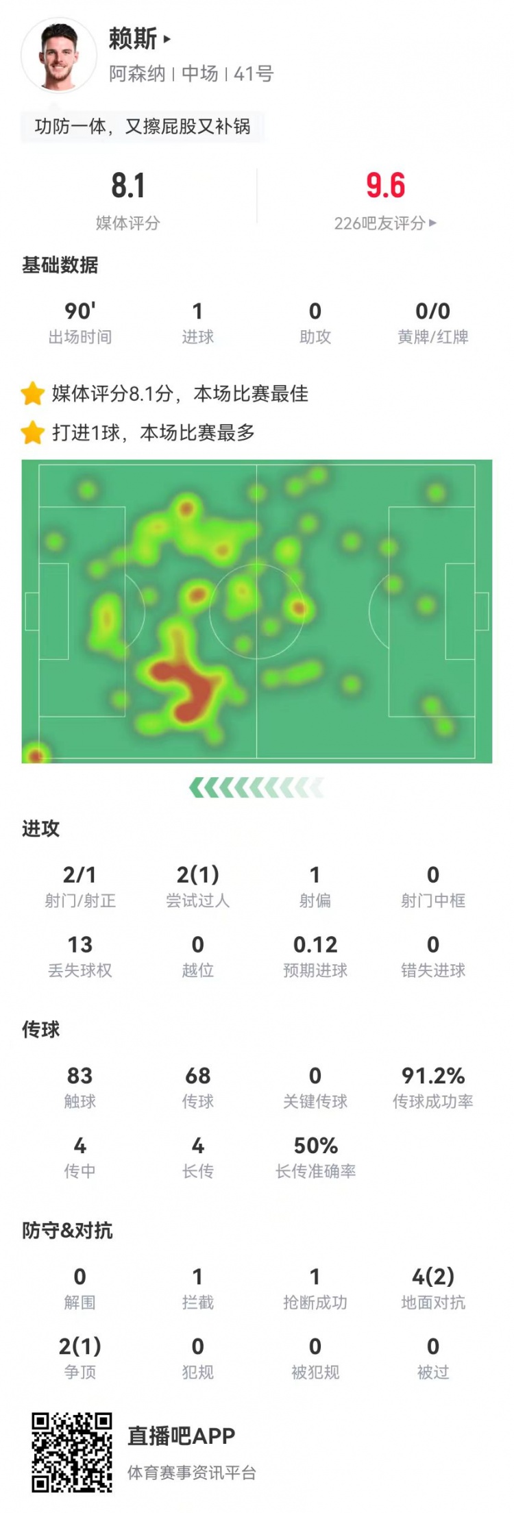 3月10日訊 阿森納在本輪英超客場1-1戰(zhàn)平曼聯(lián),賴斯本場數(shù)據(jù)如下:首發(fā)踢滿全場1球預(yù)期進球0.12預(yù)期助攻0.3083觸球68傳球、62成功,成功率91%4傳中、0成功4長傳、2成功2射門、1射正2過人、1成功6對抗、3成功13丟失球權(quán)1攔截1搶斷1救險獲評8.1分全場最高 本文標簽: 足球 英超 曼聯(lián) 阿森納