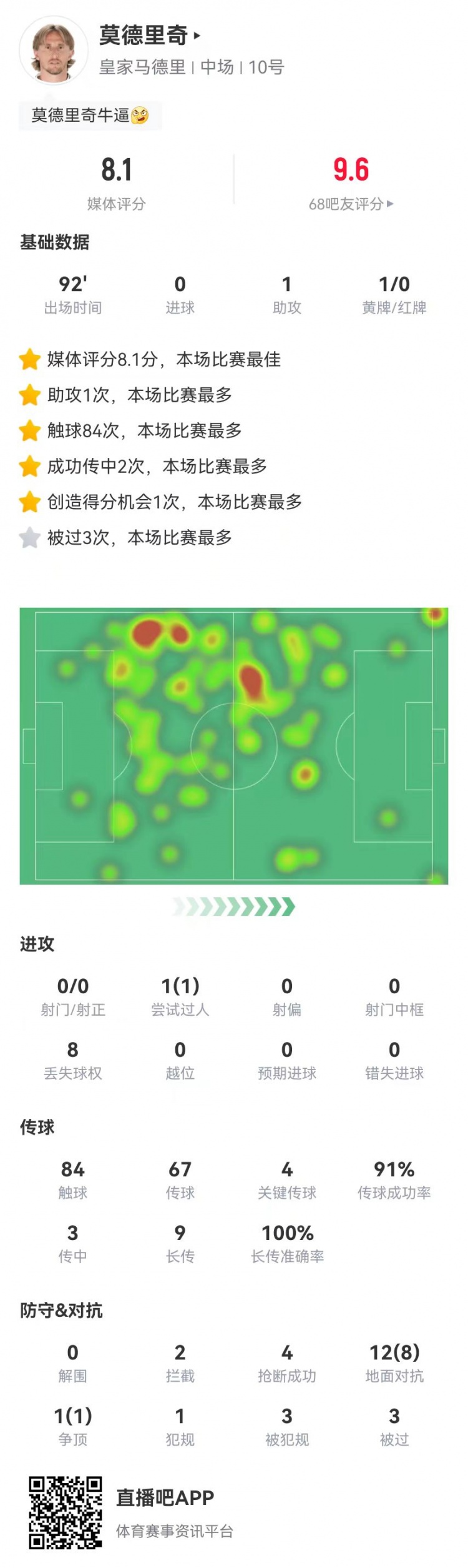 3月10日訊 皇馬在本輪西甲2-1力克巴列卡諾,莫德里奇本場數(shù)據(jù)如下:首發(fā)踢滿全場1助攻預(yù)期助攻0.1386觸球69傳球、62成功,成功率90%4關(guān)鍵傳球3傳中、2成功10長傳、9成功1創(chuàng)造重大機會1過人、1成功13對抗、9成功9丟失球權(quán)1犯規(guī)3造犯規(guī)1封堵2攔截4搶斷3被過獲評8.1分全場最高 本文標簽: 足球 西甲 皇家馬德里 巴列卡諾