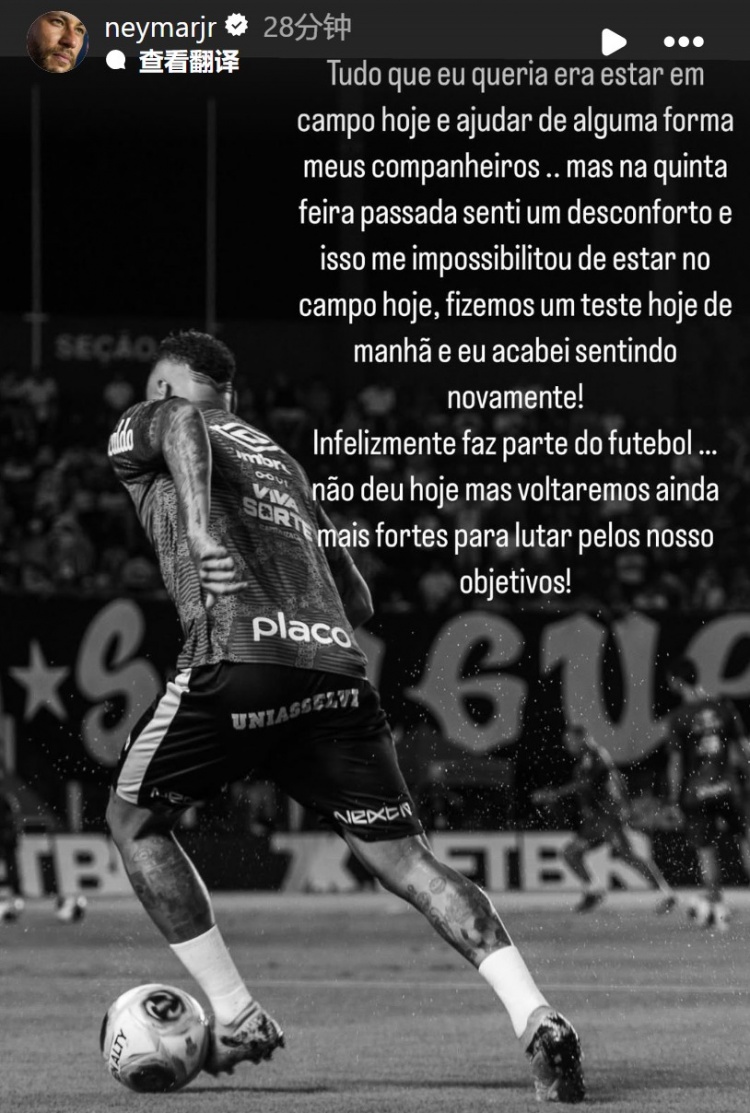 3月10日訊 今天,桑托斯在巴西錦標(biāo)半決賽的比賽中1-2不敵科林蒂安,內(nèi)馬爾在社媒發(fā)文說(shuō)明了他未能登場(chǎng)的原因。