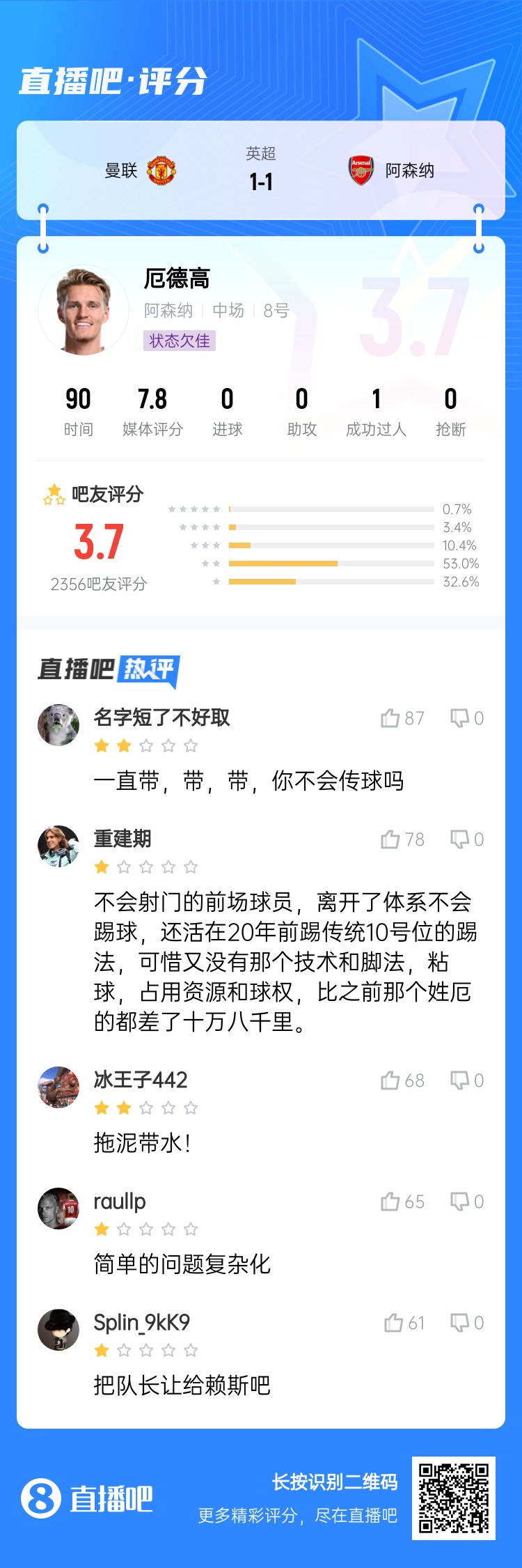 英超第28輪,阿森納客場1-1戰(zhàn)平曼聯(lián)。厄德高本場比賽首發(fā)踢滿全場,發(fā)揮糟糕。