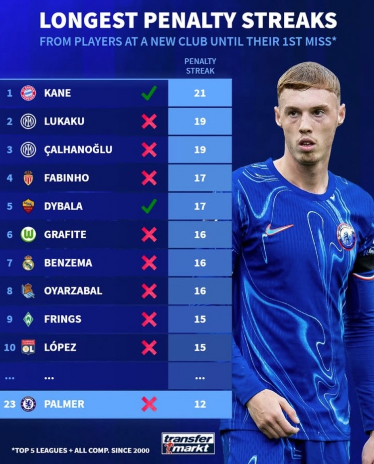 《轉(zhuǎn)會(huì)市場(chǎng)》統(tǒng)計(jì)了新世紀(jì)以來(lái)五大聯(lián)賽球員在新東家在不罰丟情況下連續(xù)命中點(diǎn)球紀(jì)錄,凱恩21球居首并且仍未罰丟。