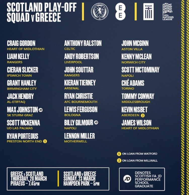 3月11日訊 即將到來(lái)的歐國(guó)聯(lián)A聯(lián)賽升級(jí)賽,蘇格蘭將和希臘進(jìn)行兩回合的比賽。目前,蘇格蘭已經(jīng)公布了大名單,羅伯遜、麥克托米奈領(lǐng)銜,蒂爾尼在列。