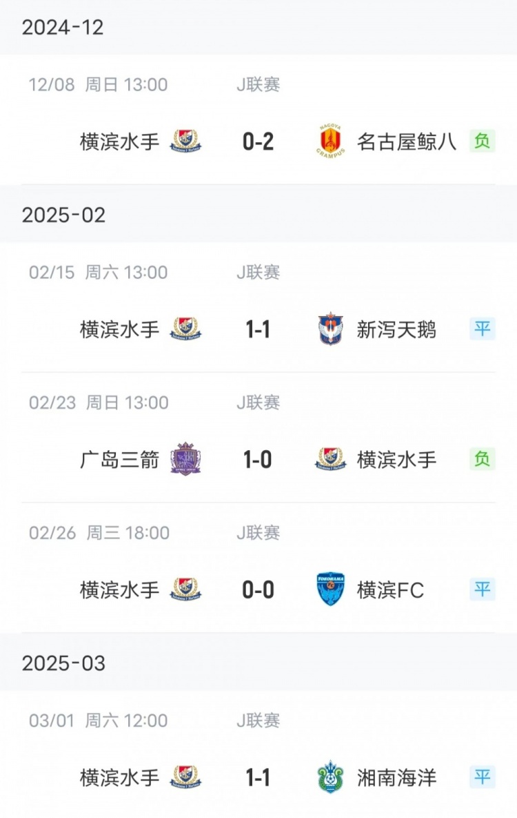 數(shù)據(jù)顯示,本賽季J聯(lián)賽戰(zhàn)罷5輪,橫濱水手還未嘗勝績(jī),4輪聯(lián)賽(橫濱少賽一場(chǎng))僅3平1負(fù)打進(jìn)2球,目前積3分排在J聯(lián)賽積分榜第18位。而算上上賽季的話,橫濱水手在J聯(lián)賽已經(jīng)連續(xù)5場(chǎng)不勝(3平2負(fù)打進(jìn)2球丟掉5球)。