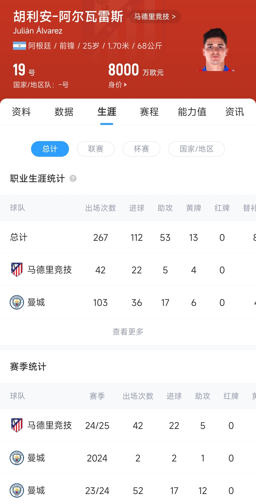 阿爾瓦雷斯本賽季數(shù)據(jù):42場22球5助