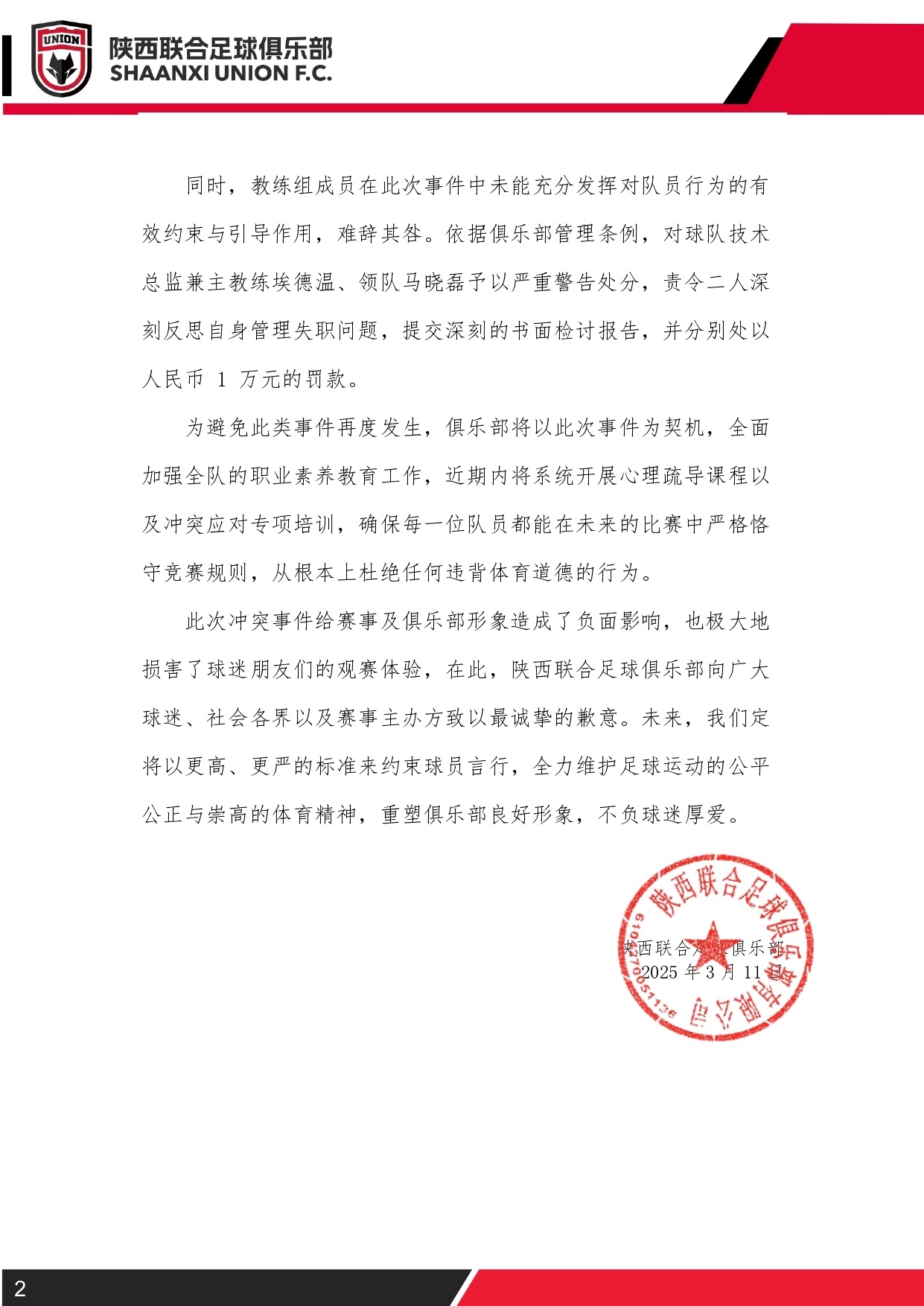 此次沖突事件給賽事及俱樂部形象造成了負(fù)面影響,也極大地?fù)p害了球迷朋友們的觀賽體驗(yàn),在此,陜西聯(lián)合足球俱樂部向廣大球迷、社會(huì)各界以及賽事主辦方致以最誠(chéng)摯的歉意。未來,我們定將以更高、更嚴(yán)的標(biāo)準(zhǔn)來約束球員言行,全力維護(hù)足球運(yùn)動(dòng)的公平公正與崇高的體育精神,重塑俱樂部良好形象,不負(fù)球迷厚愛。