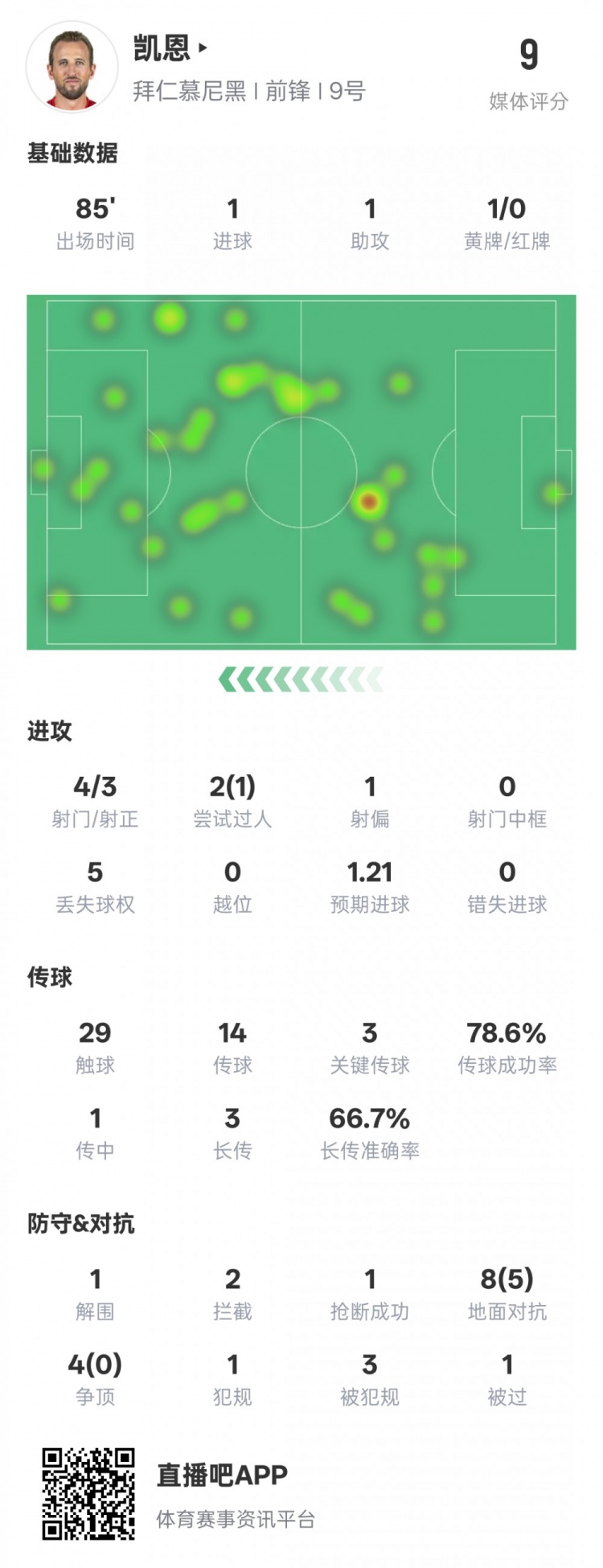 凱恩本場(chǎng)比賽數(shù)據(jù)如下: