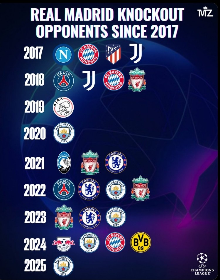 外媒也列出皇馬自2017年以來在歐冠淘汰賽所有對(duì)手,除了2019年的阿賈克斯之外均為五大聯(lián)賽球隊(duì),具體如下: