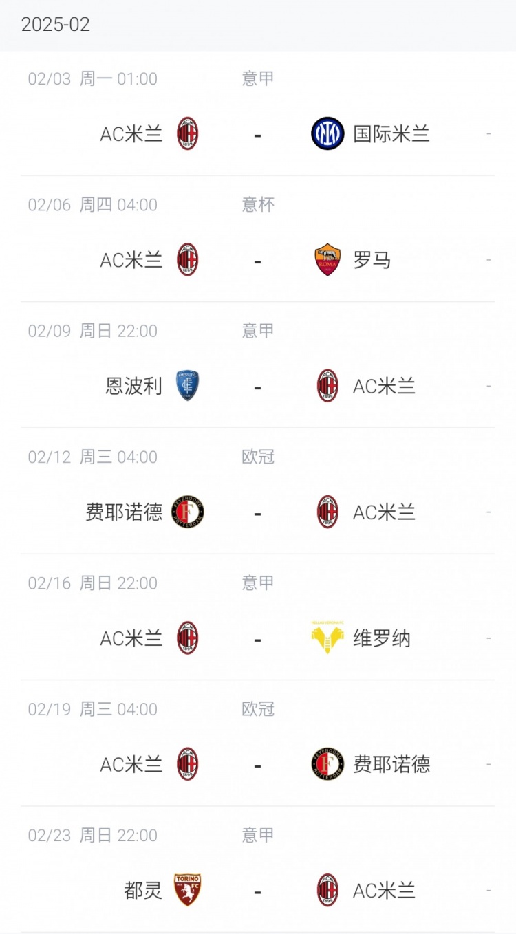 1月31日訊 歐冠附加賽抽簽結(jié)束,AC米蘭將迎戰(zhàn)費(fèi)耶諾德。米蘭2月份賽程如上圖。其中,北京時(shí)間2月3日將迎來本賽季意甲第二次米蘭德比,3天后的2月6日在意大利杯迎戰(zhàn)羅馬;12日和19日在歐冠附加賽迎戰(zhàn)費(fèi)耶諾德,AC米蘭先客后主。 本文標(biāo)簽: 足球 意甲 AC米蘭 國際米蘭 羅馬 歐冠