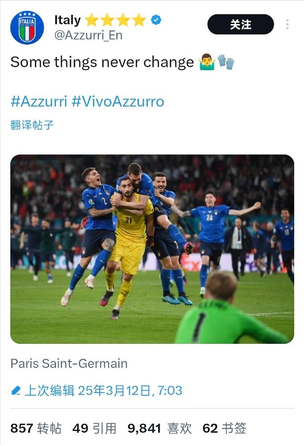 賽后,意大利國家隊(duì)官推曬出了2020歐洲杯決賽多納魯馬撲出決勝點(diǎn)球的瞬間,并寫道:“有些事情永遠(yuǎn)都不會(huì)改變”。當(dāng)時(shí)意大利隊(duì)與東道主英格蘭隊(duì)在決賽戰(zhàn)至點(diǎn)球大戰(zhàn),三獅軍團(tuán)第4、5順位出場的桑喬和薩卡的點(diǎn)球都被多納魯馬擋出,英格蘭隊(duì)無緣隊(duì)史首座歐洲杯冠軍。繼那屆歐洲杯之后,多納魯馬再次給英格蘭足球送上一記“重?fù)簟薄?/span>