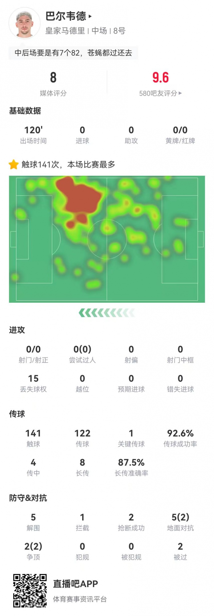 3月13日訊 皇馬在本輪歐冠點(diǎn)球淘汰馬競,巴爾韋德本場數(shù)據(jù)如下: