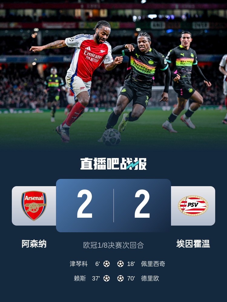歐冠1/8決賽次回合,阿森納2-2戰(zhàn)平埃因霍溫,總比分9-3晉級八強(qiáng)。上半場,津琴科破門,佩里西奇扳平,賴斯頭球建功,斯特林送出2次助攻&錯失1次單刀球機(jī)會;下半場,德里歐挑射破門。