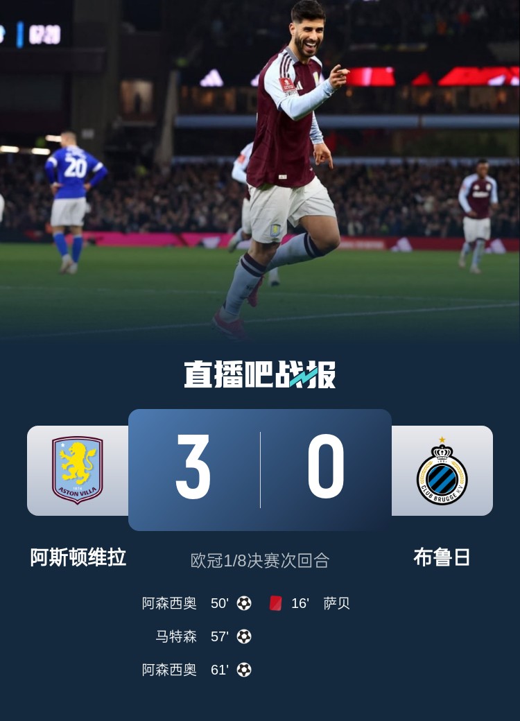 歐冠1/8決賽次回合,維拉3-0擊敗布魯日,總比分6-1晉級歐冠8強(qiáng)。上半場,大馬丁精準(zhǔn)長傳找到拉什福德,后者制造直紅;下半場,阿森西奧替補(bǔ)登場雙響,另有一次中柱,拉什福德貢獻(xiàn)1助攻,馬特森打進(jìn)1球。