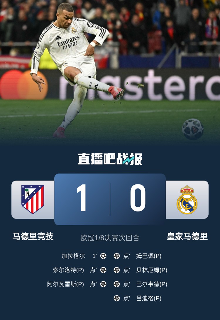 歐冠1/8決賽次回合,皇馬兩回合2-2,點球大戰(zhàn)4-2擊敗馬競晉級歐冠8強(qiáng),將迎戰(zhàn)阿森納。上半場,加拉格爾閃擊破門,阿爾瓦雷斯兩次勁射被庫爾圖瓦撲出;下半場,姆巴佩造點,維尼修斯主罰打飛;加時賽,雙方均未制造破門良機(jī);點球大戰(zhàn),阿爾瓦雷斯滑倒二次觸球進(jìn)球無效,巴斯克斯主罰被撲,略倫特?fù)糁袡M梁。